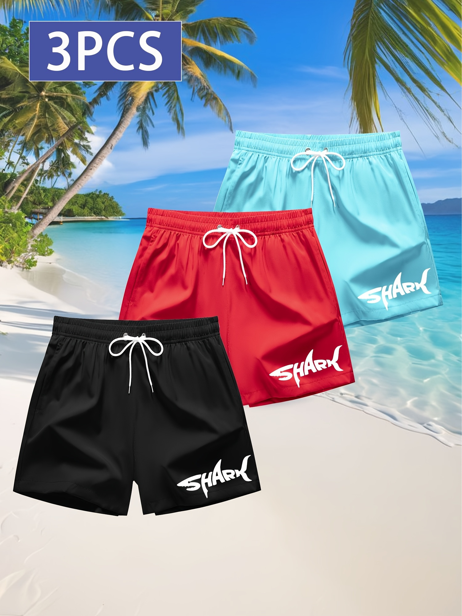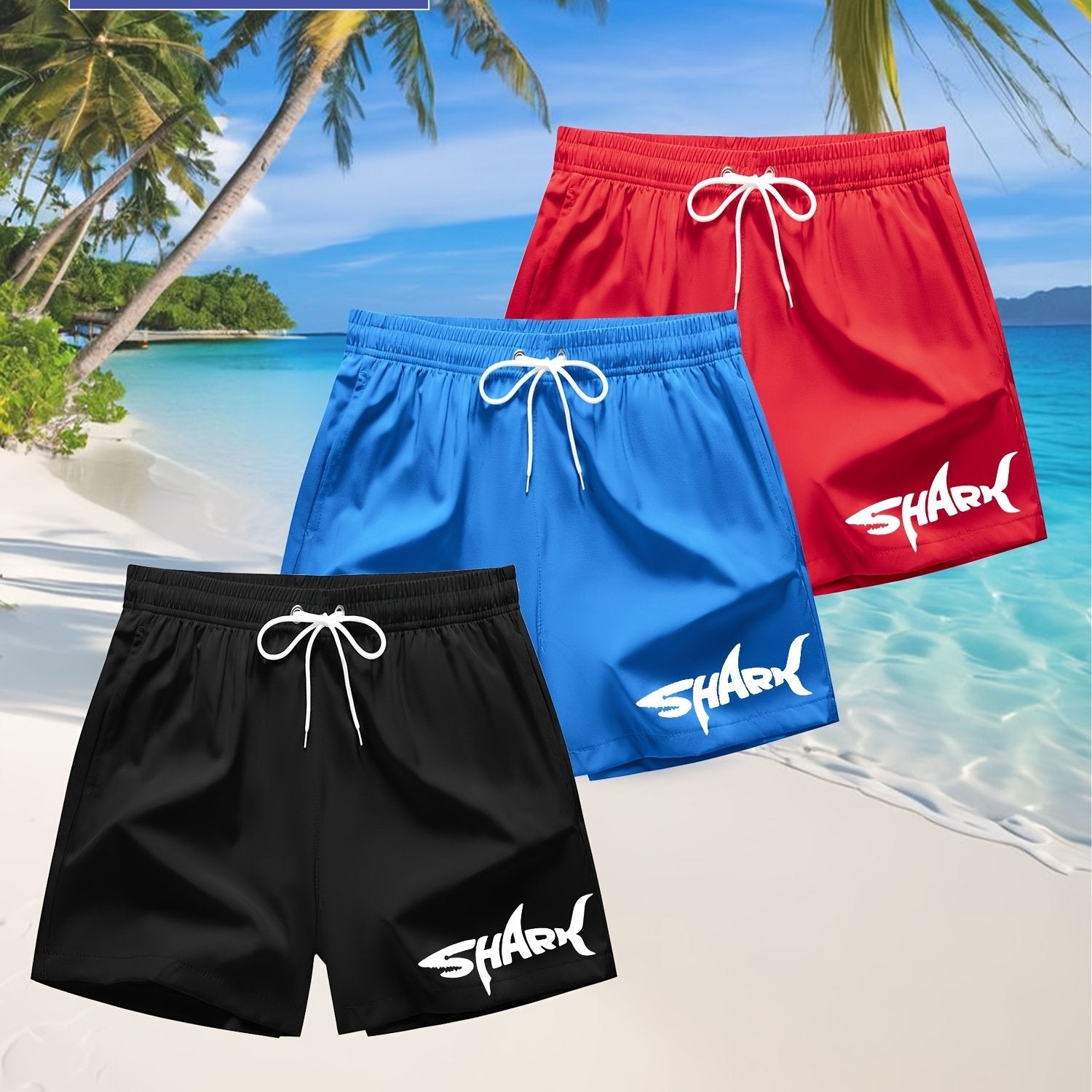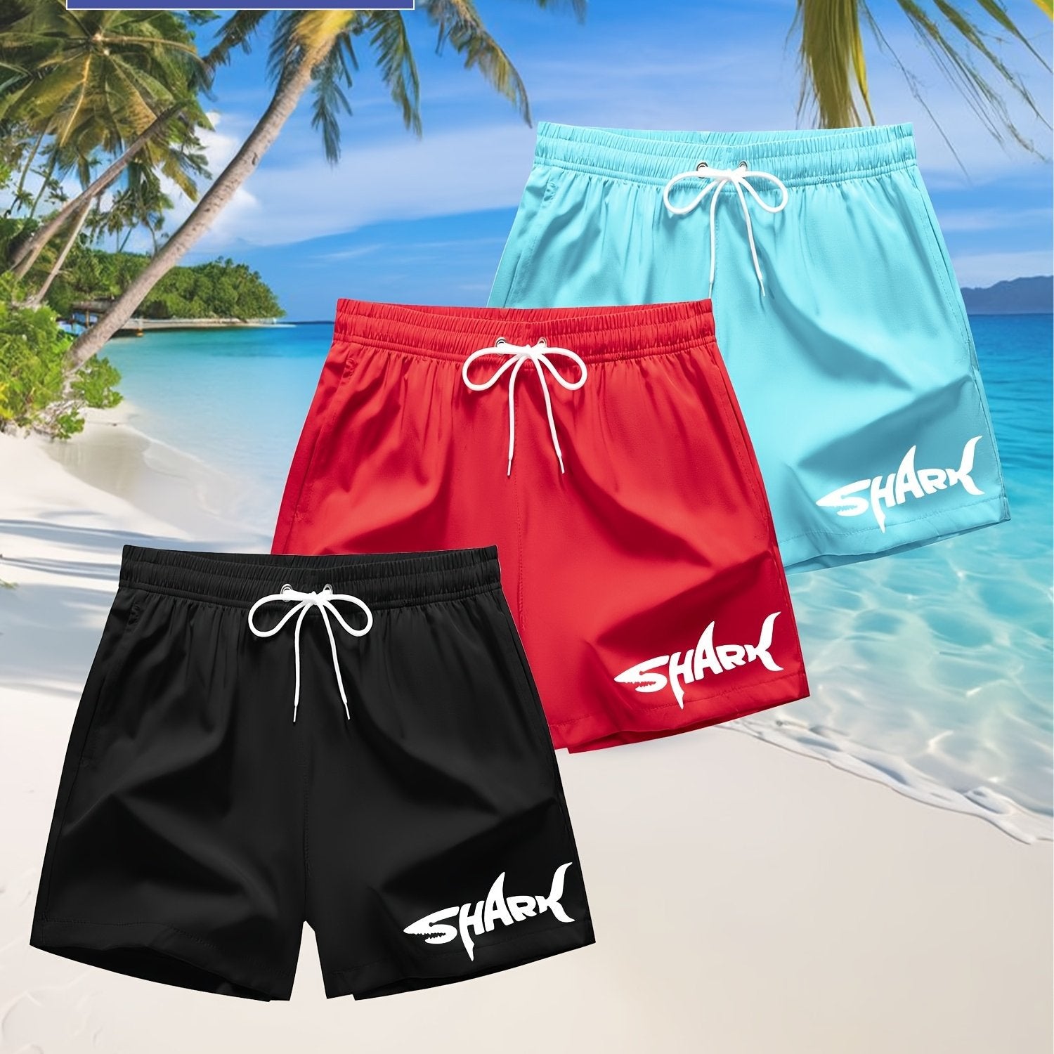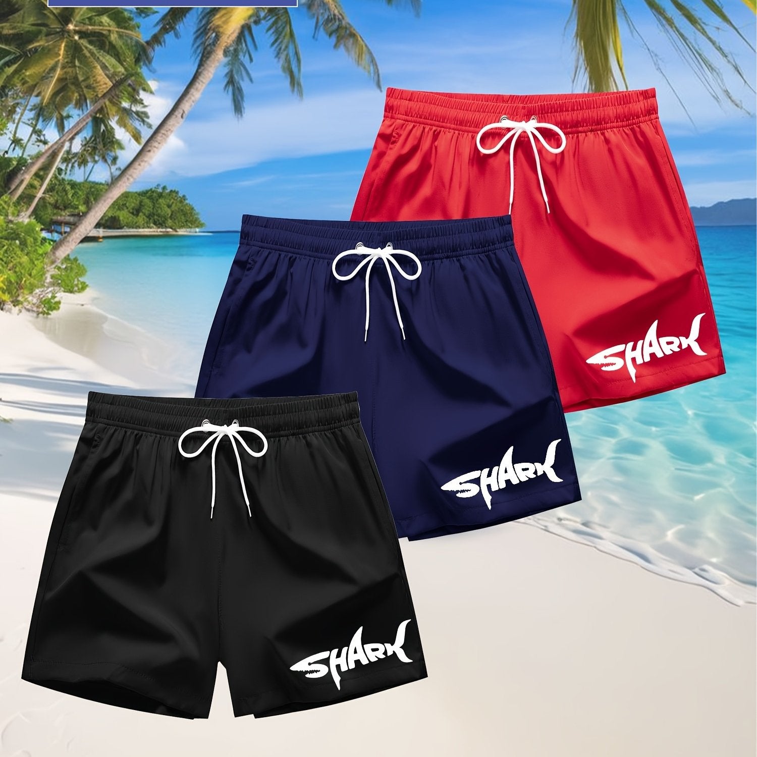 3 броя мъжки бански гащета - бързосъхнещи плажни шорти с регулируема талия с връзки, щампи с акула в червено, черно, светлосиньо - леки бански за сърф, басейн, ваканция - нееластична материя за борд спортове
