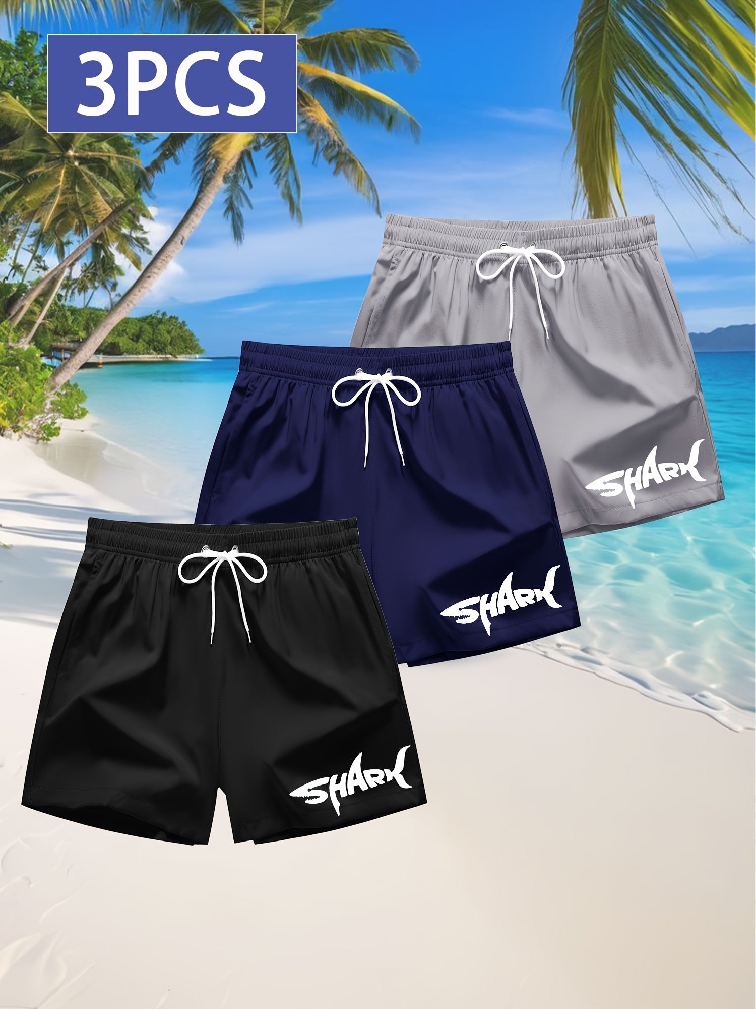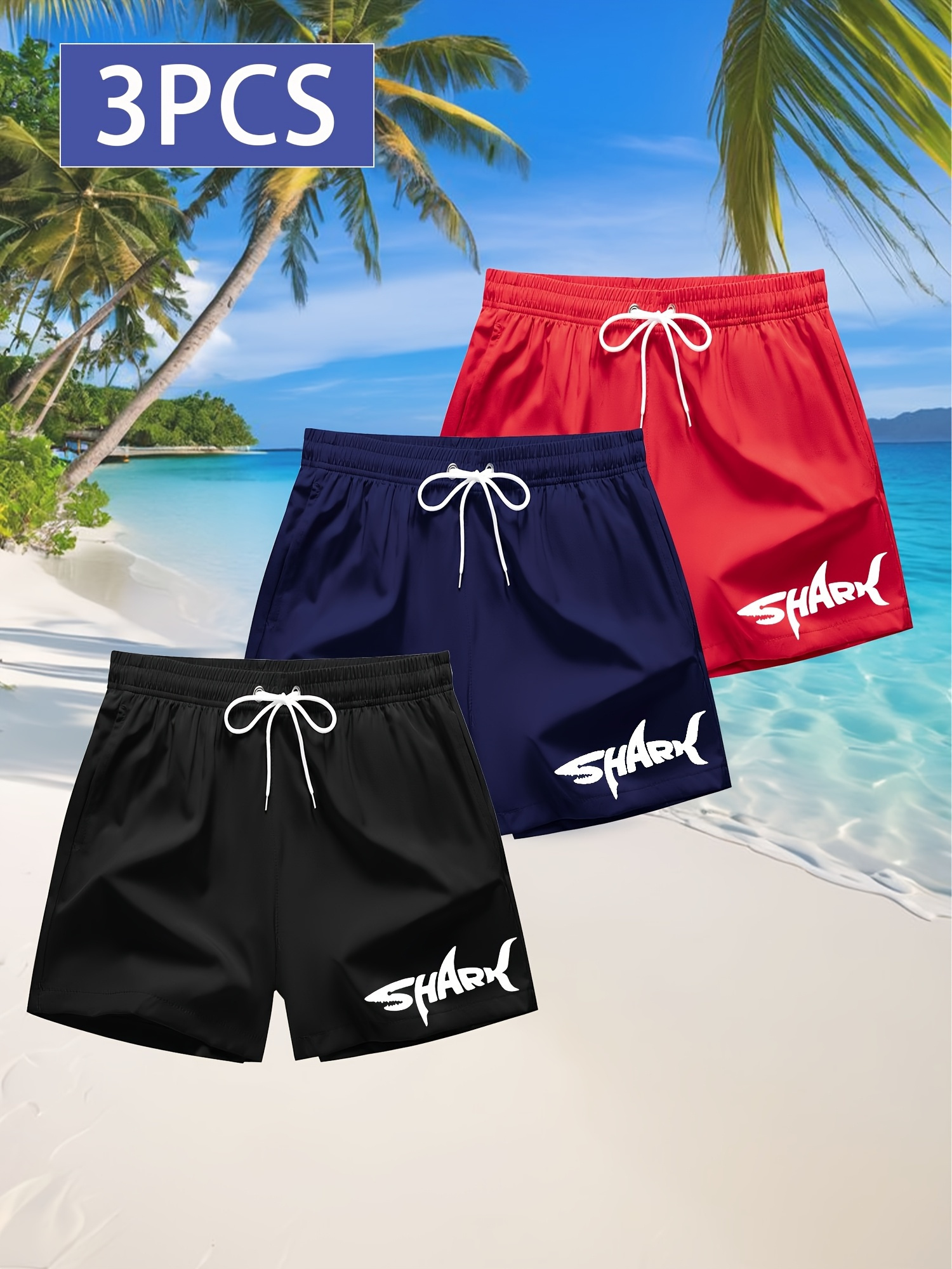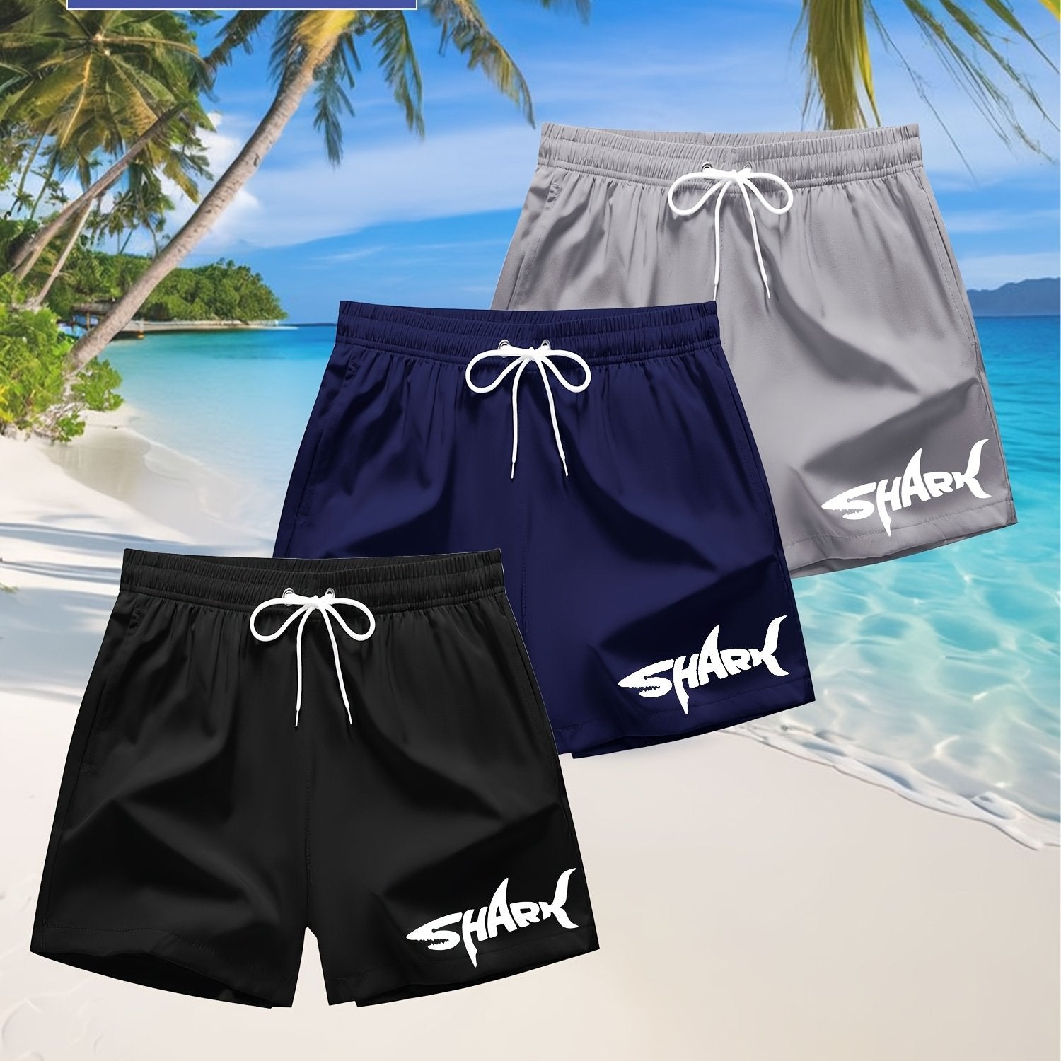 3 броя мъжки бански гащета - бързосъхнещи плажни шорти с регулируема талия с връзки, щампи с акула в червено, черно, светлосиньо - леки бански за сърф, басейн, ваканция - нееластична материя за борд спортове