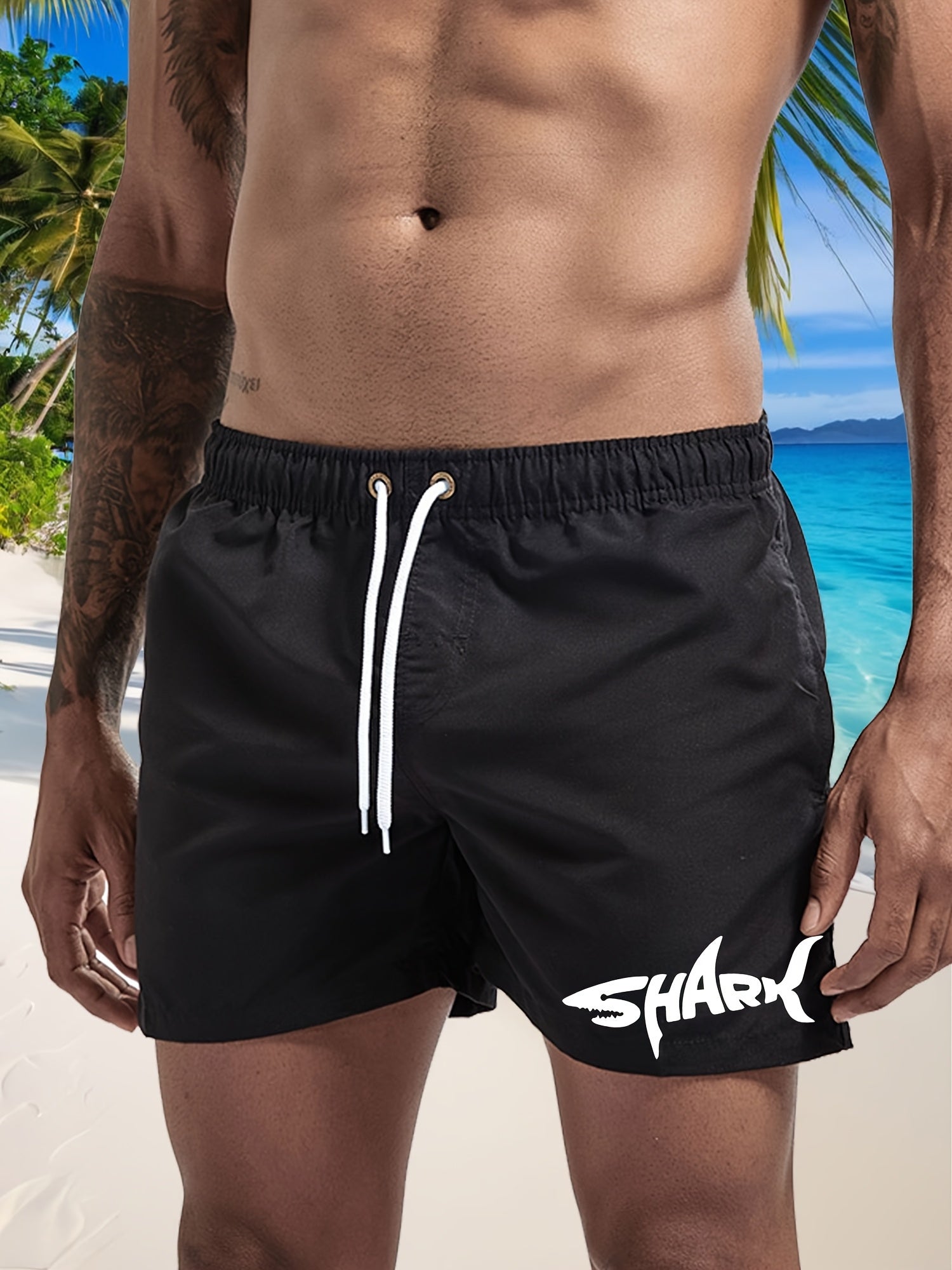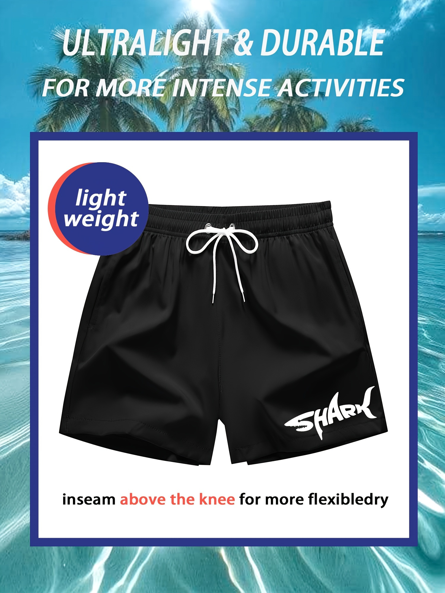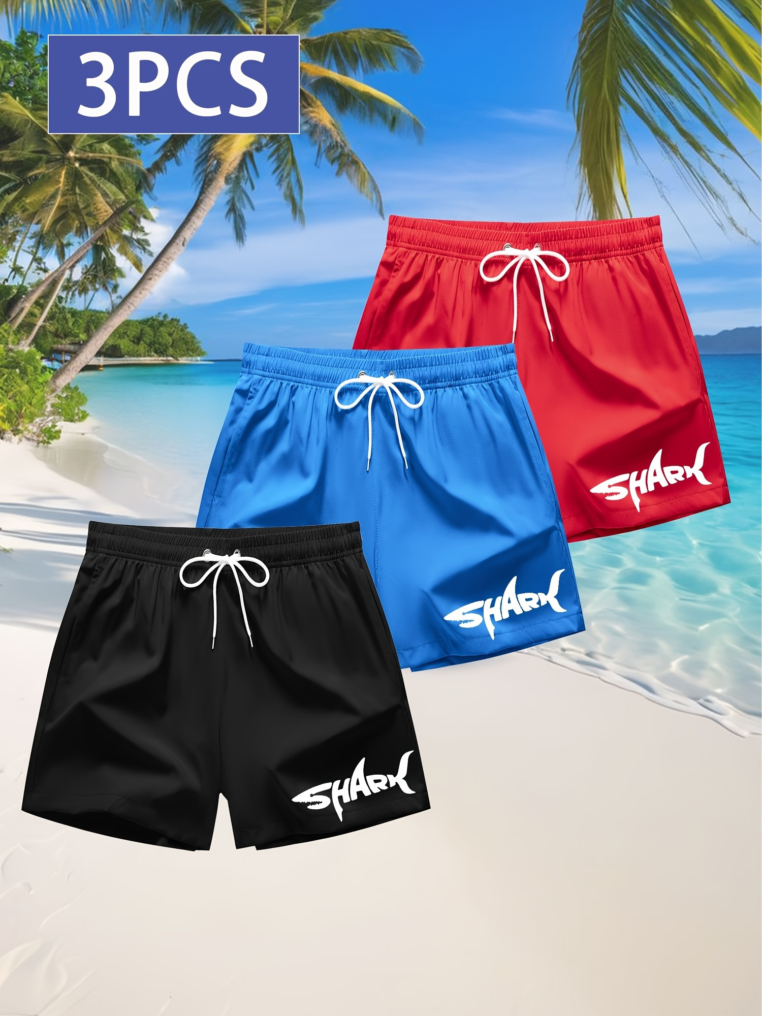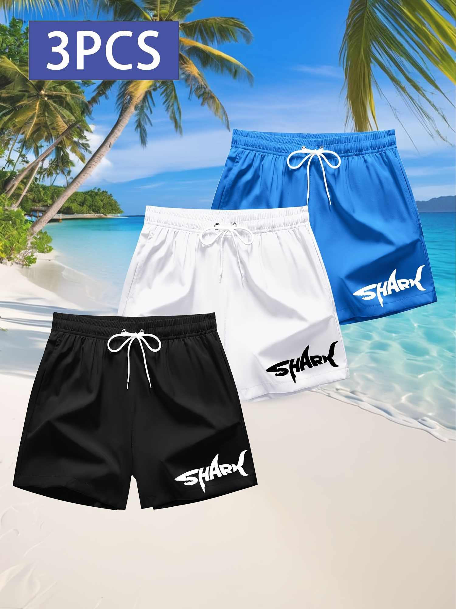3 броя мъжки бански гащета - бързосъхнещи плажни шорти с регулируема талия с връзки, щампи с акула в червено, черно, светлосиньо - леки бански за сърф, басейн, ваканция - нееластична материя за борд спортове