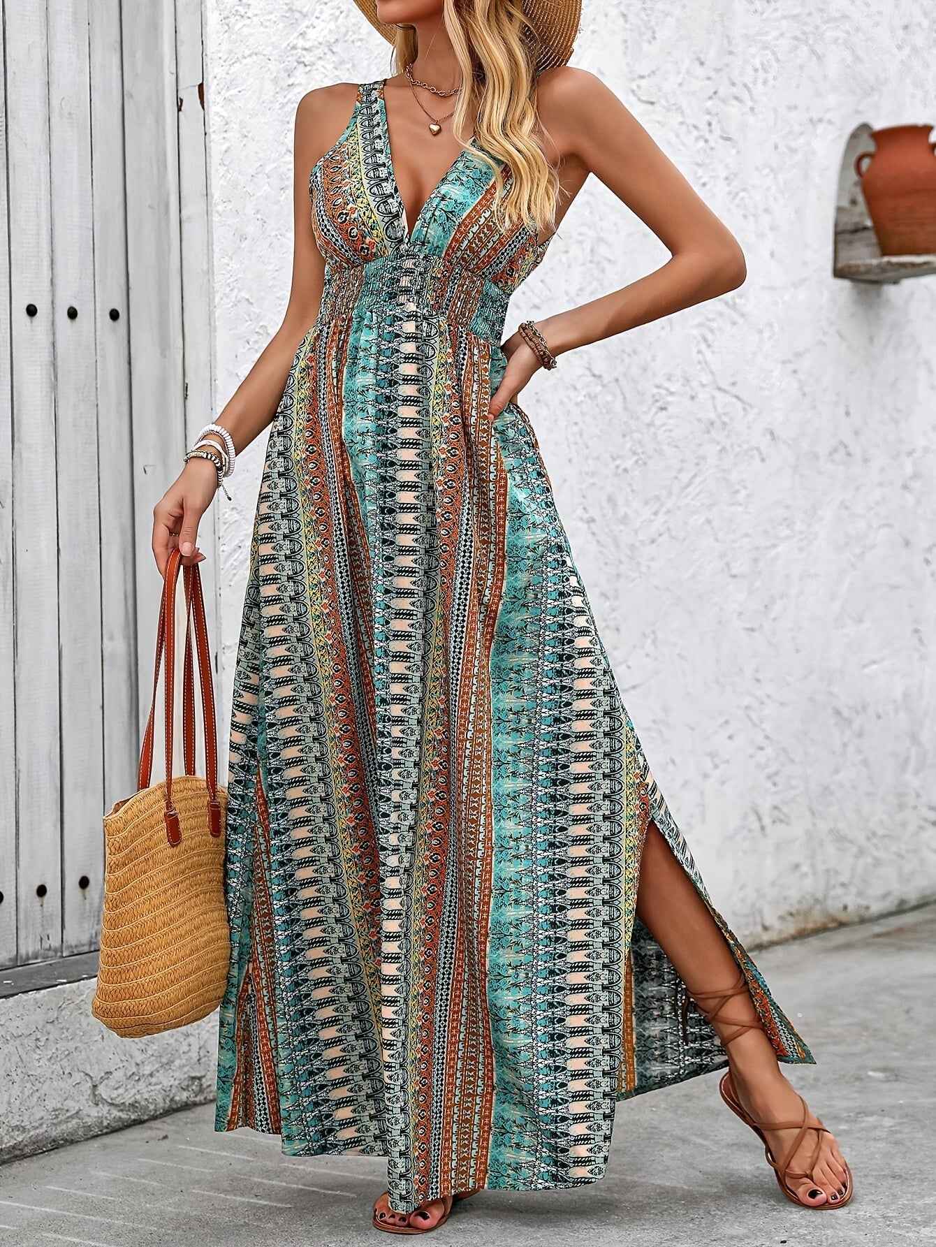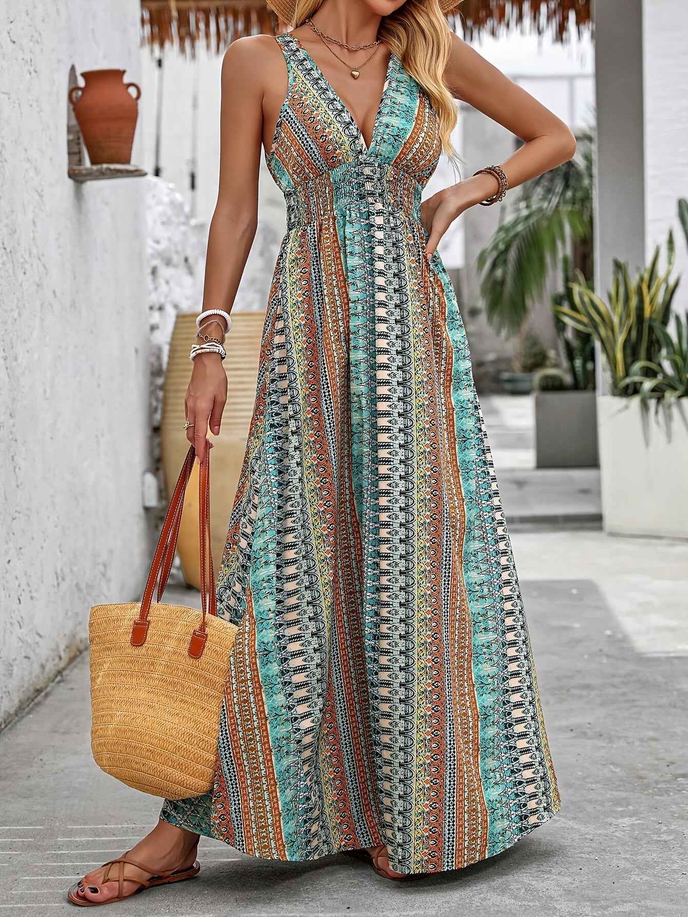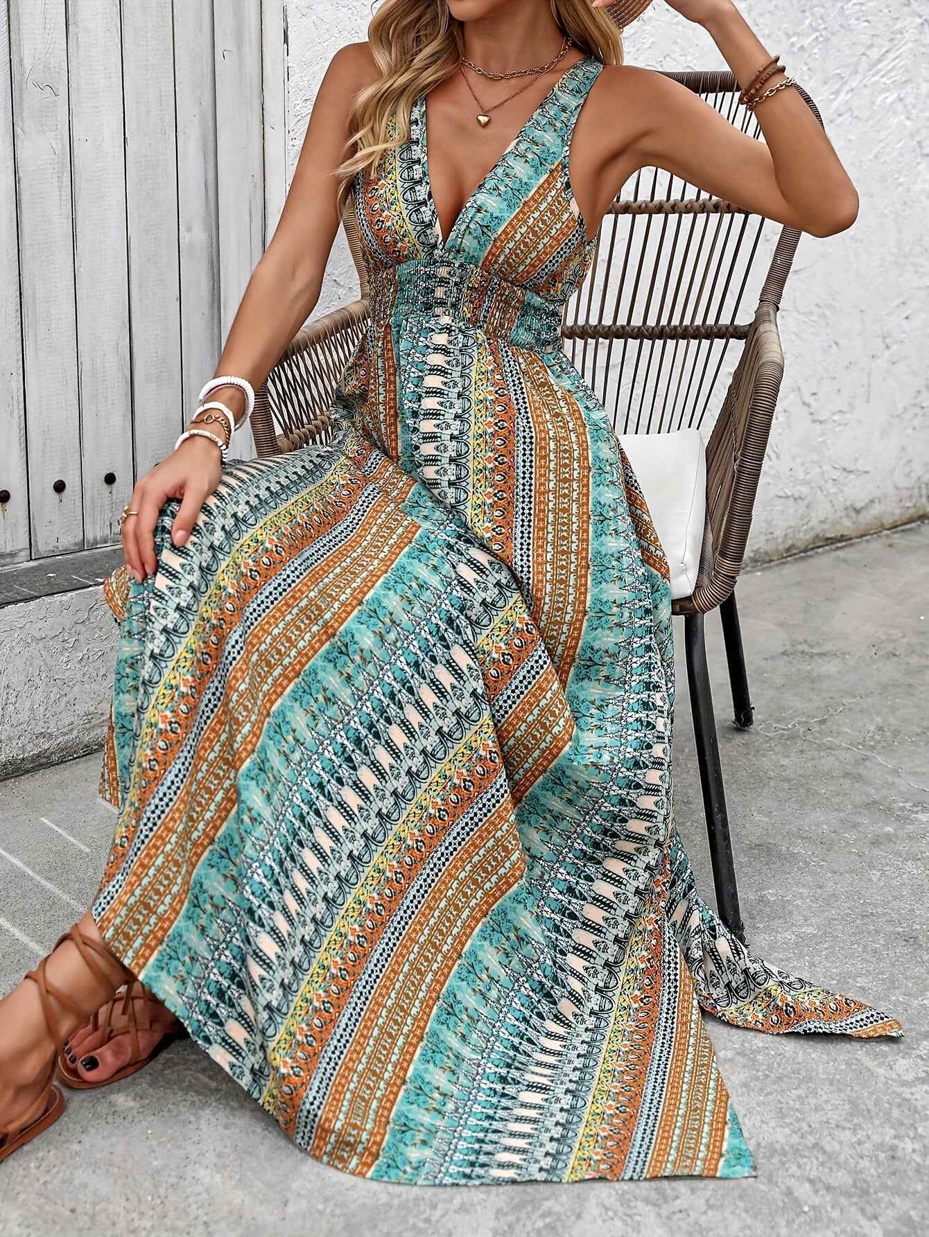Макси рокля с V-образно деколте във ваканционен стил, полиестерен флорален принт и райета, без ръкави, набрана талия, с кръстосан подгъв, за лятото