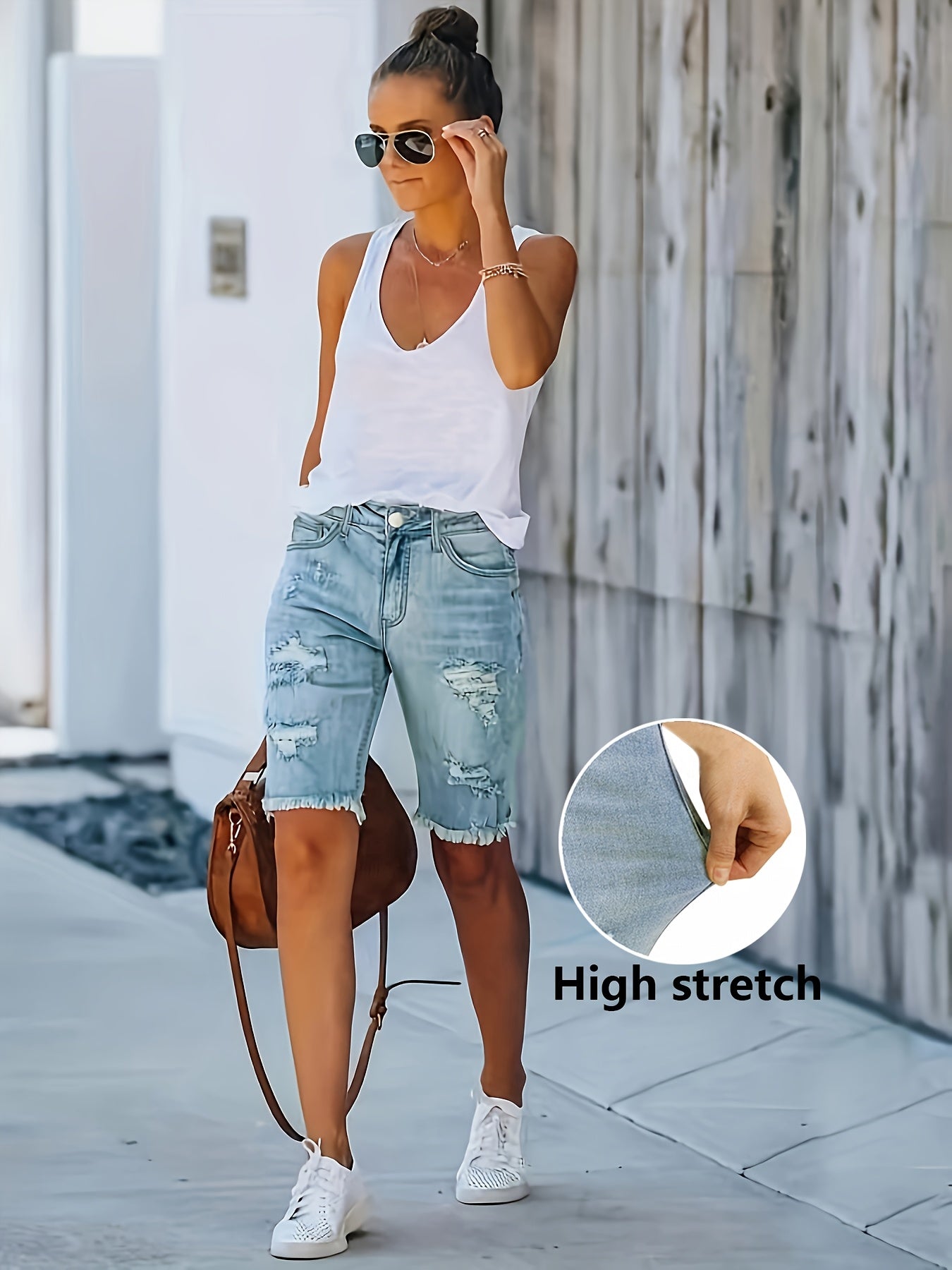 Дамски летни нови еластични дънкови шорти с коремче и необработен подгъв, ретро светлосини изпънати, слим крой, средна дължина, ресни, висока талия и джобове, дамско облекло от 90-те, удобни ежедневни панталони, подходящи за...