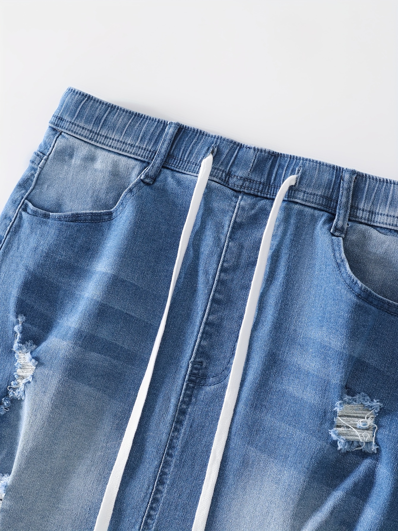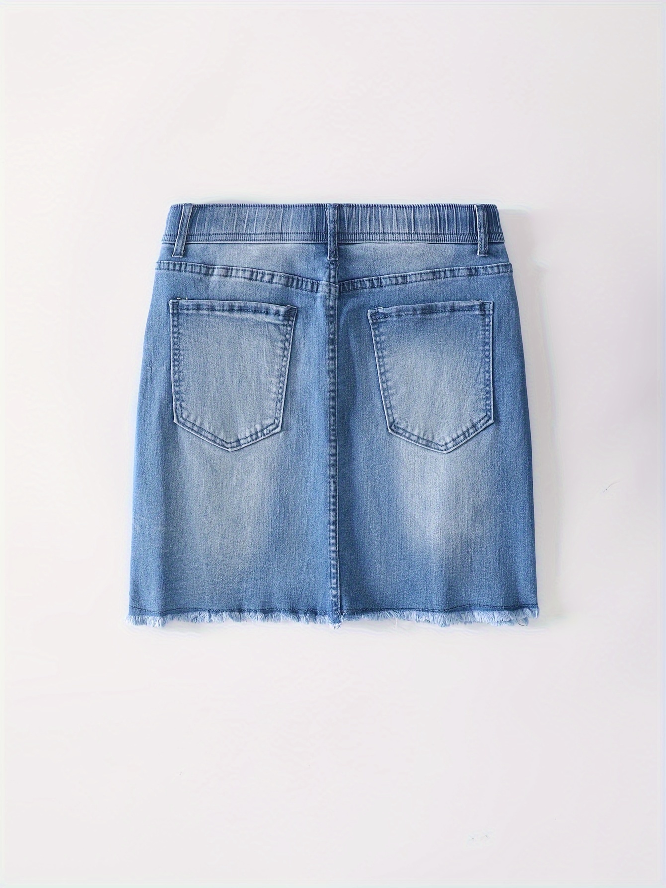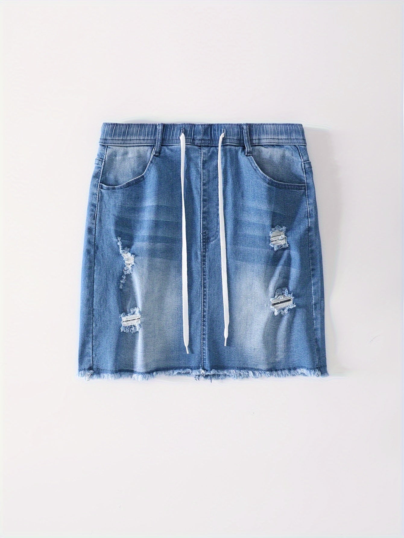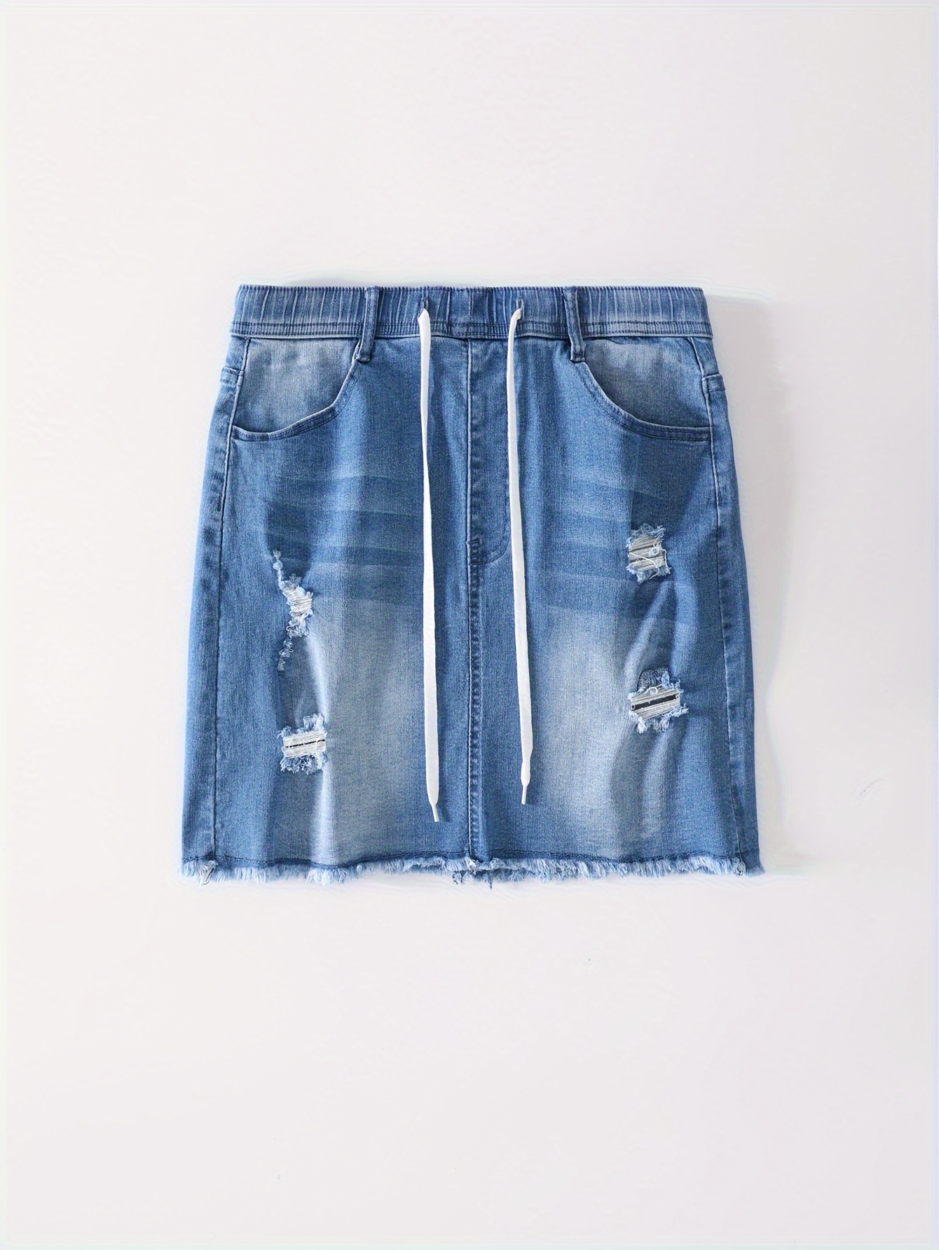 Дамска къса облечена дънкова пола, ежедневен разкъсан дизайн с изтъркан дизайн, средно разтеглива, талия с връзки, едноцветна, тъкан плат, 320 г/м² хастар, за пролет/лято/есен