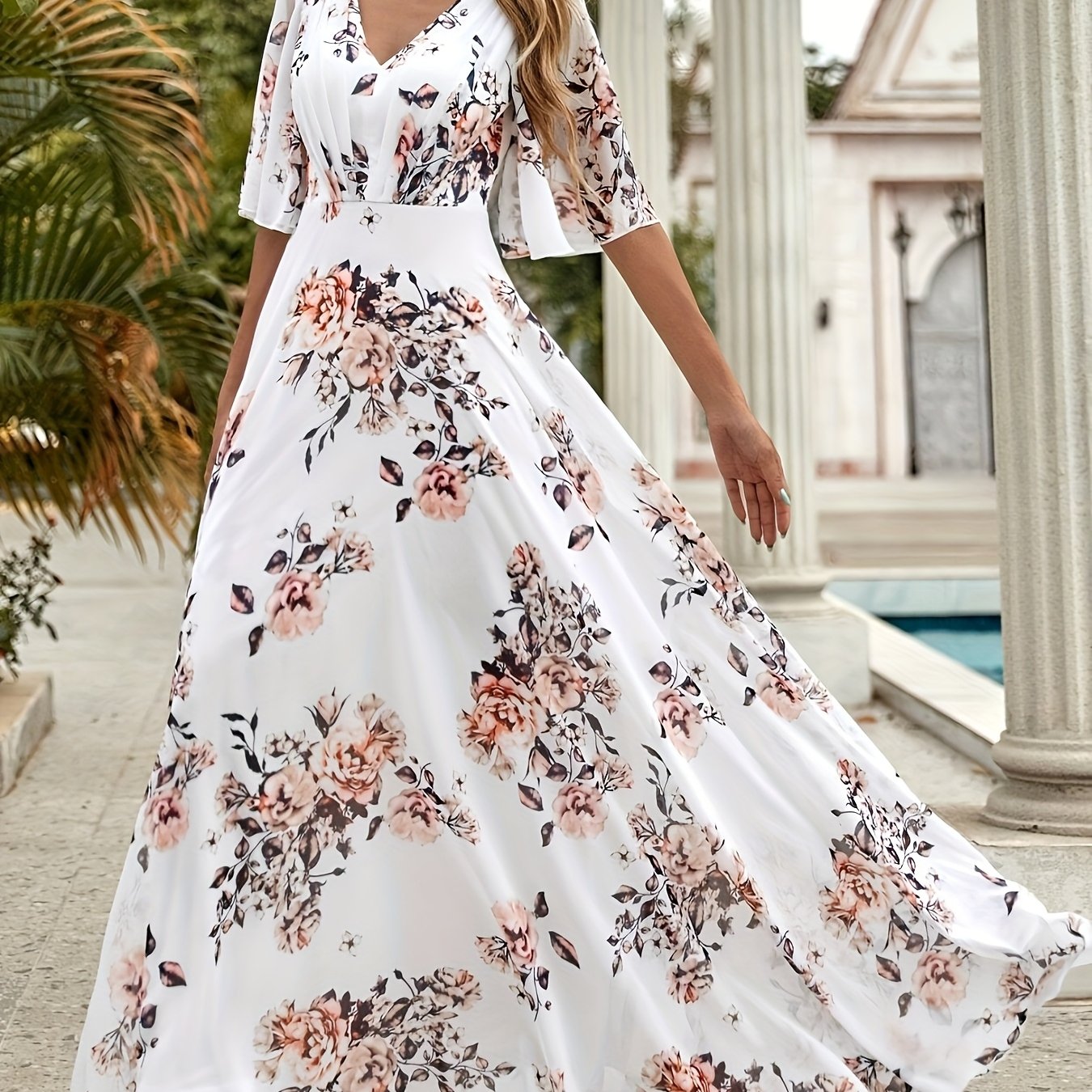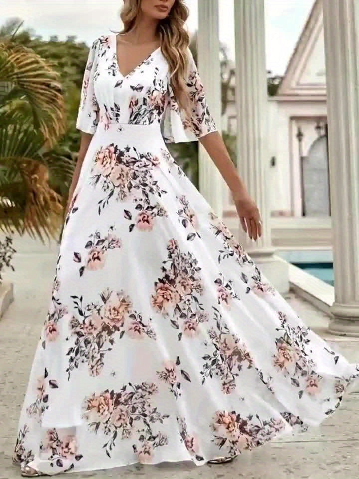 Women's Elegant V-Neck Floral Print Dress with Ruffled Short Sleeves - A-Line Long Maxi Dress, Machine Washable, Zipper Back, All-Season Versatile for Casual & Formal Occasions, Cute Dresses, Flowy Fabric Gown, Lightweight Ma
